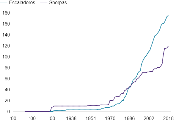 Pero si bien ese es un número que va en aumento, las proporción en cuanto a la cantidad de montañistas que ascienden más arriba del campamento base ha caído por debajo del 1%.